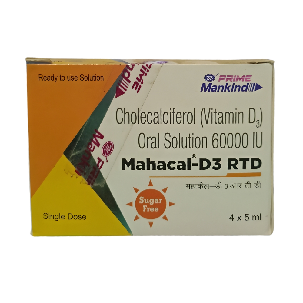 Mahacal-D3 RTD is a ready-to-use Vitamin D3 (Cholecalciferol) oral solution designed to help manage Vitamin D deficiency and support bone strength, immunity, and overall health. It is a sugar-free, single-dose formula that comes in a pack of 4 × 5 ml for convenient use as directed by a healthcare professional.